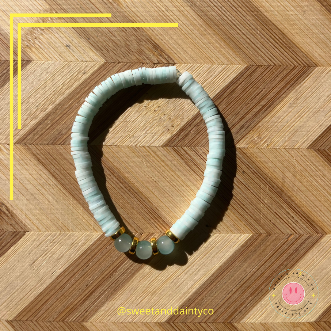 A soft blue band mixed with a clear-ish white, gold accents and soft blue glass beads