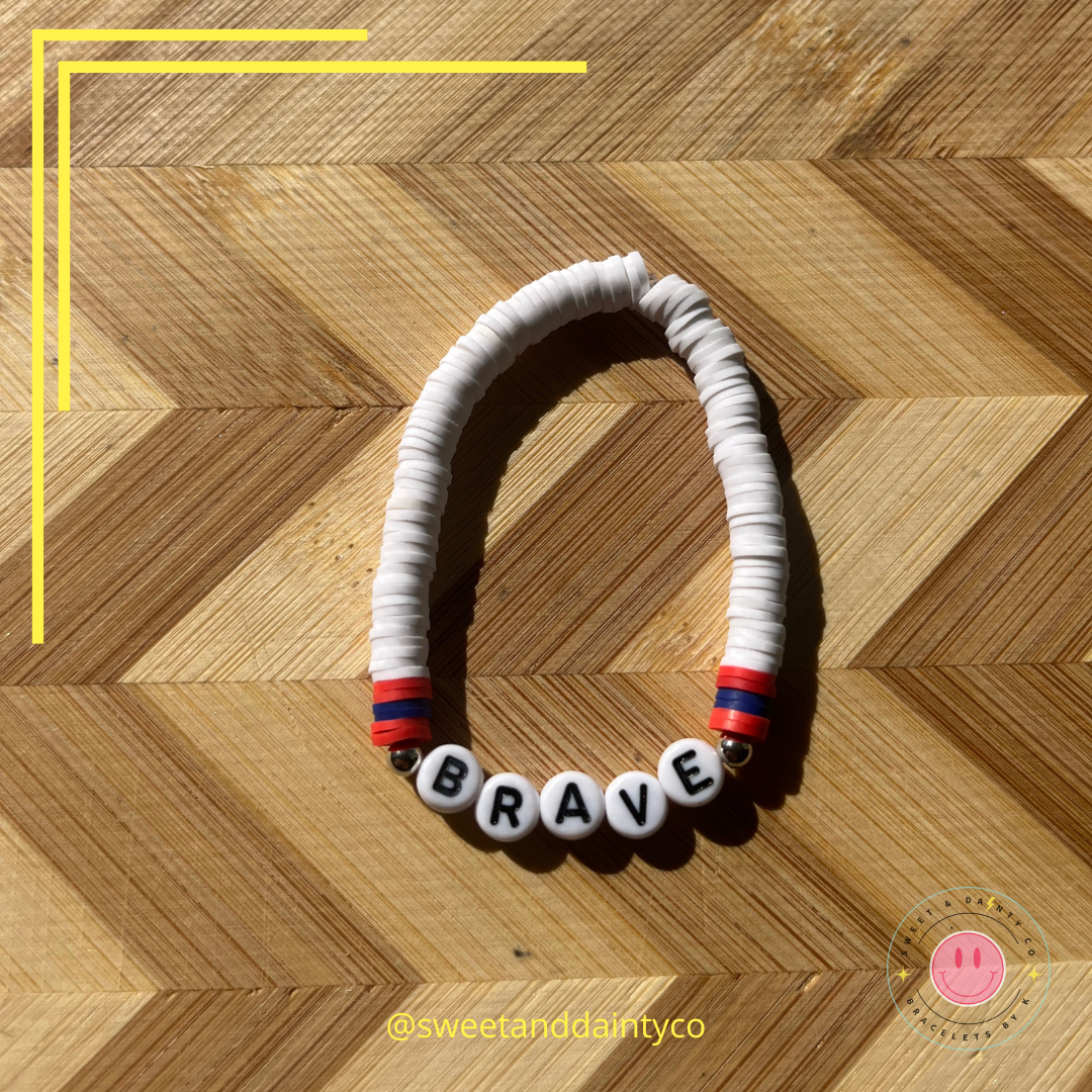 White band with red and bright blue accent, silver ball bead accent, BRAVE lettering in black