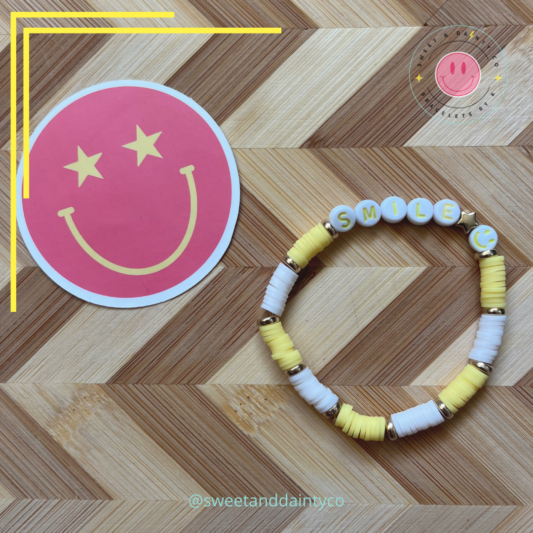 A bright yellow and white duo paired with gold accents and yellow words SMILE with a gold star and yellow smile to remind you all day to smile through the hard, and the good!