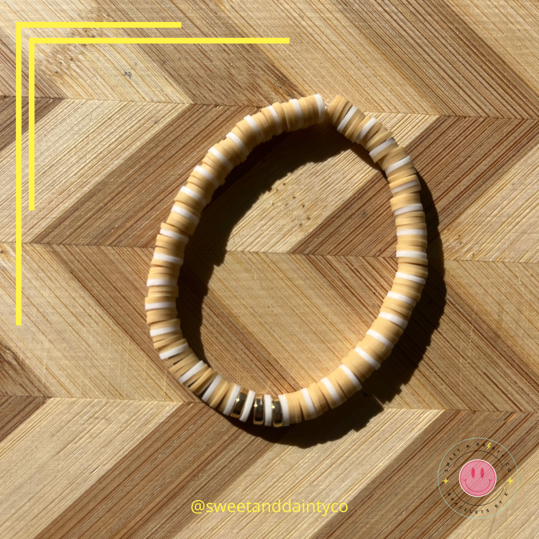 A soft butterscotch color stripped with white, gold accents