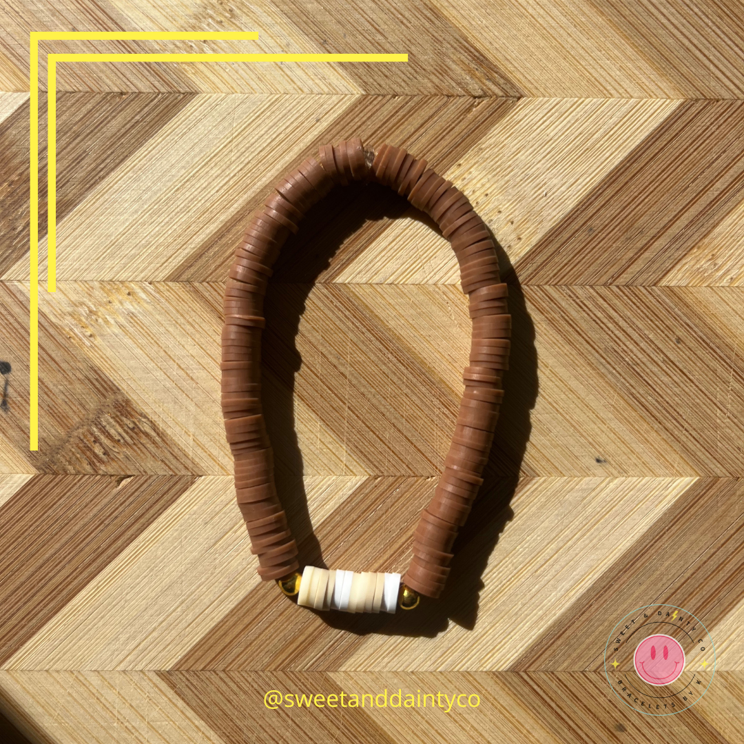 Brown band with gold bead accents with the center cream, light brown, tan