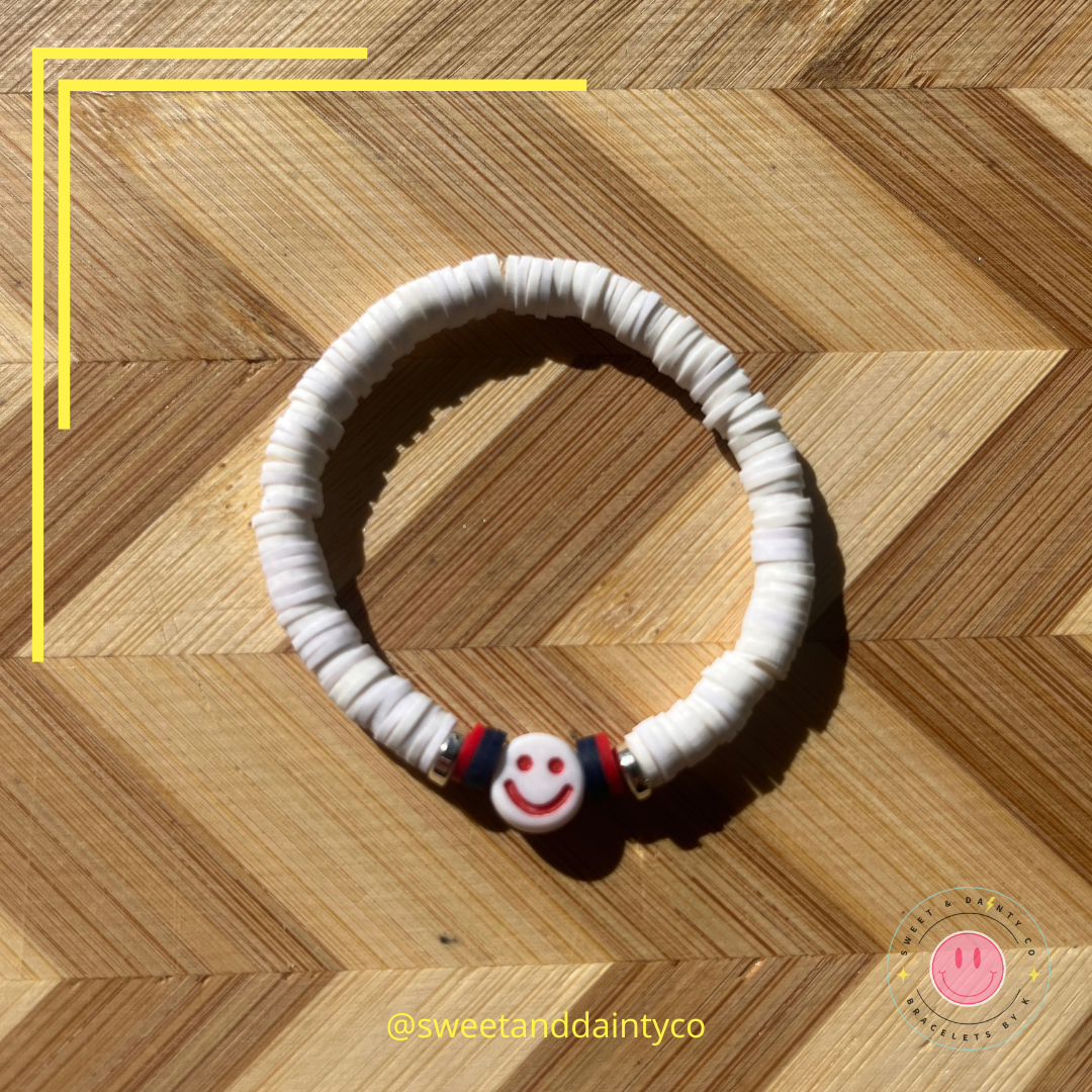 white band with navy blue, red and silver accents with white and red smiley face