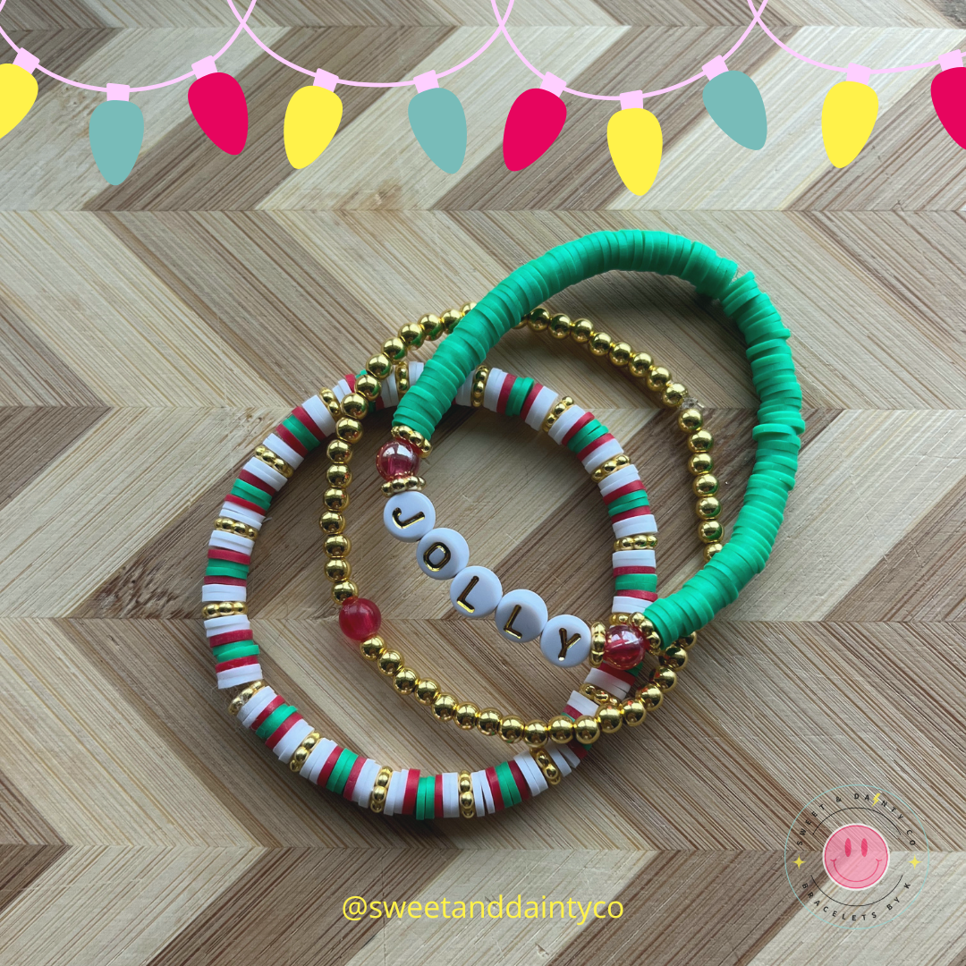 solid bright Christmas green band with floral gold spacers, red round clear beads with the word "JOLLY" in the center.