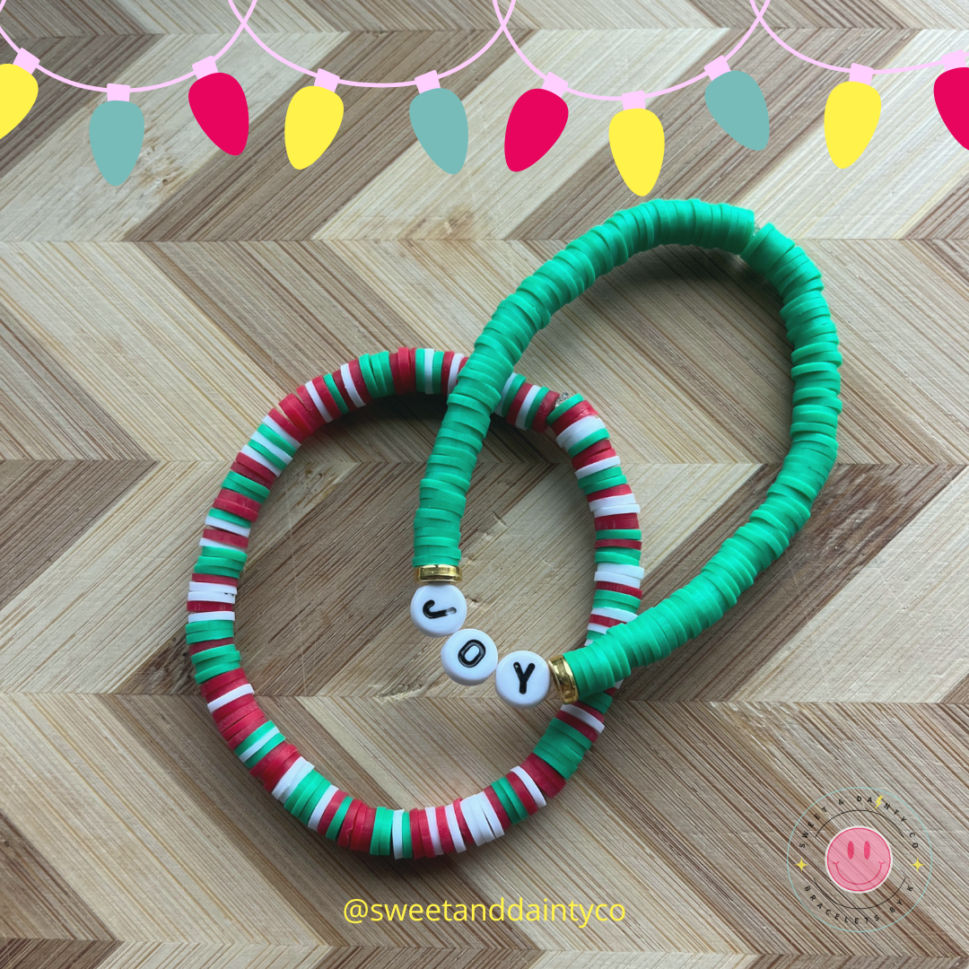 A fun mix of Christmas reds and greens with a solid green band with gold spacers and the word "JOY".