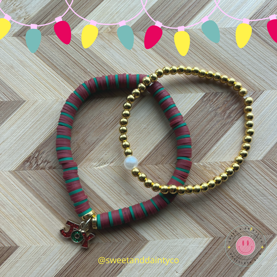 A soft maroon paired with a darker christmas green, gold spacers and a red and green JOY Charm. It pairs with a solid gold band with a sweet and dainty pearl. Wear this one any time of year!