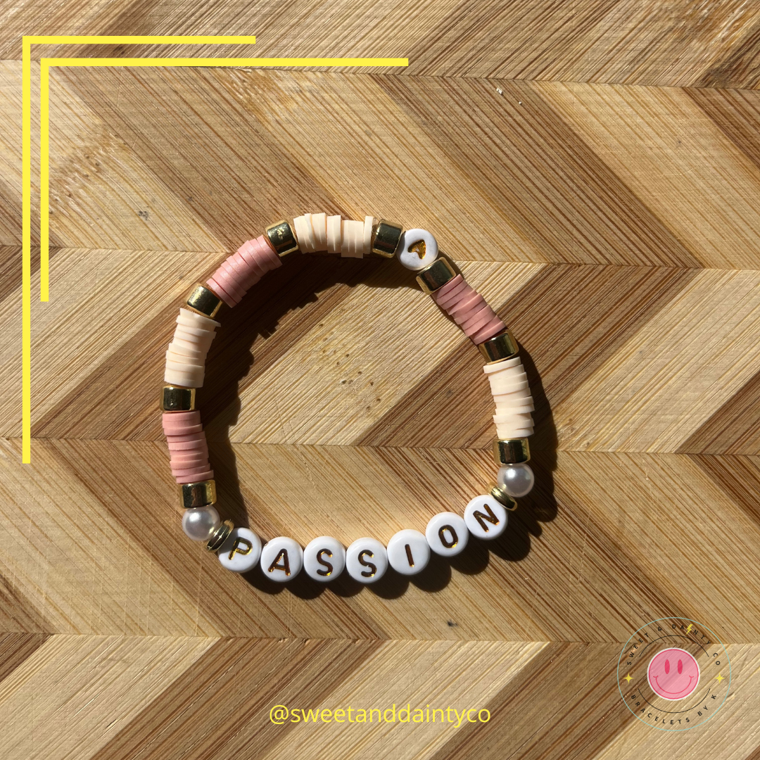 A soft pink with cream and gold band, PASSION in gold lettering with a gold heart. A beautiful reminder to have passion in your heart for all you set out to do.