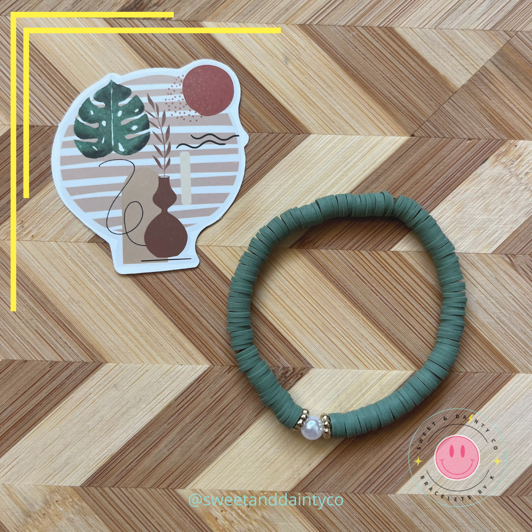 Sage green clay bead with the scalloped gold accent and a precious pearl in the center.