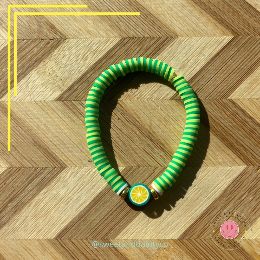 A fun striped yellow and kelly green band with gold accent and a yellow, white and green lime charm
