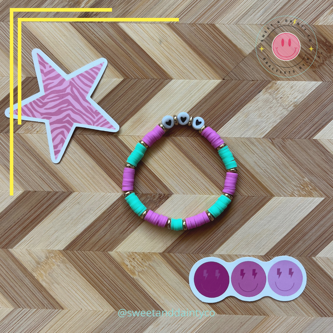 Three's a charm with these 3 hearts, white with Black paired with gold accent and a mint and purple-pink duo band