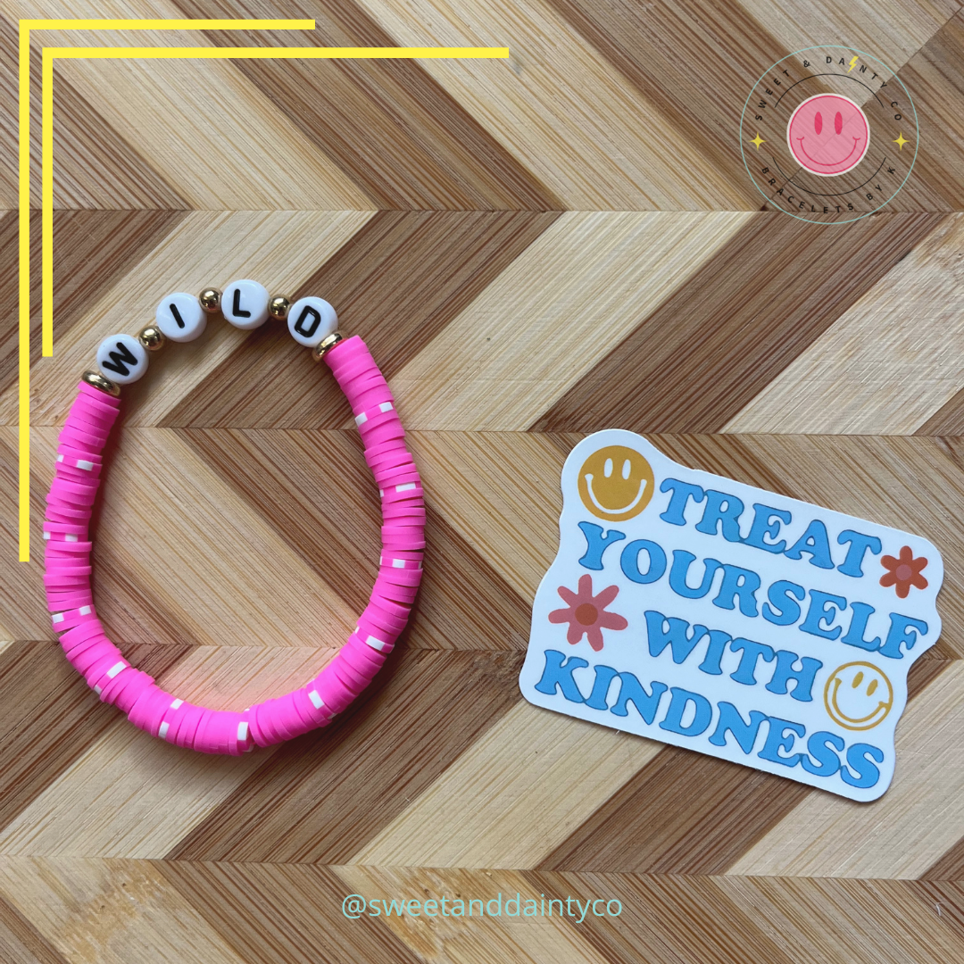 Dainty and Fun with a side of Wild with this bright pink and gold ball accents. Black lettering WILD