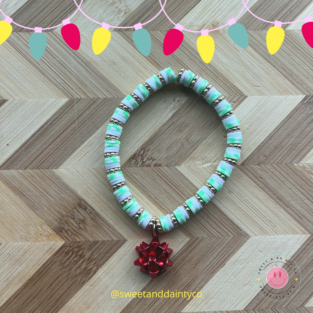 A fun red bow charm paired with gold floral spacers striped between white and soft lime pastel green speckled band.
