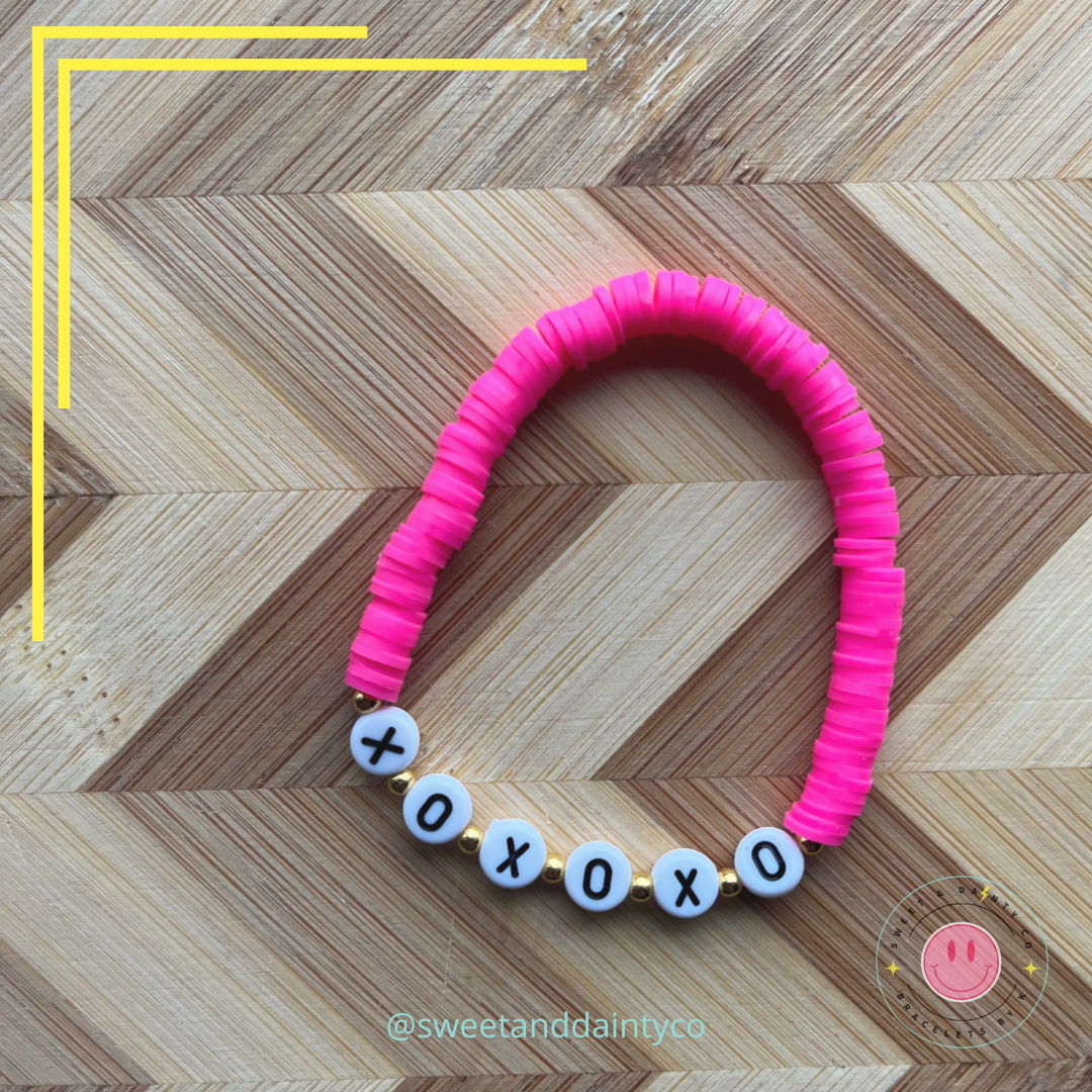 Bright pink with XOXOXO in black and white and gold spacers