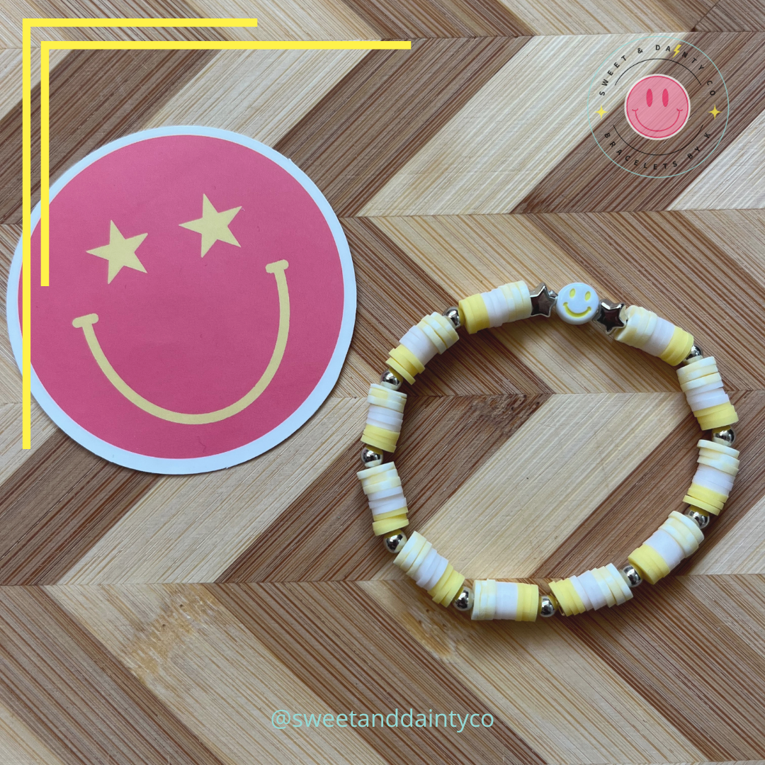 White and silver with a pop of soft yellow throughout to brighten not only your wrist, but your day !